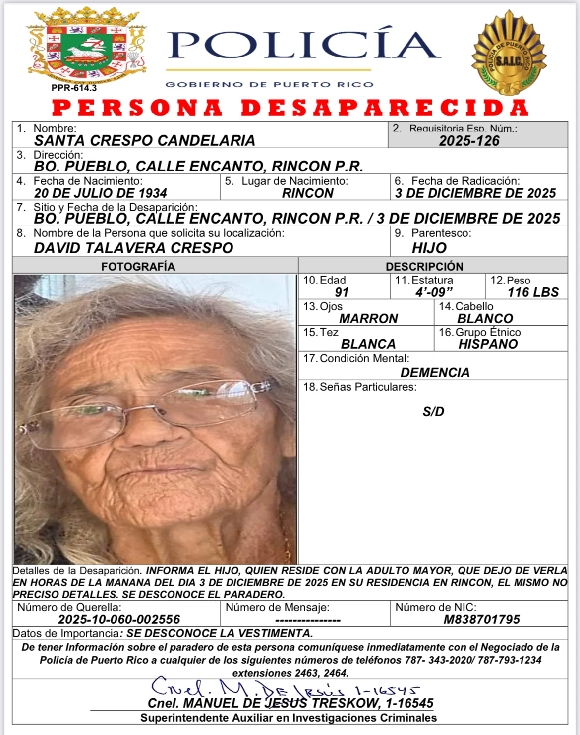 Crespo Candelaria es de tez blanca, cabello blanco, ojos marrón, mide 4’09” y pesa 116 libras aproximadamente y padece de demencia.