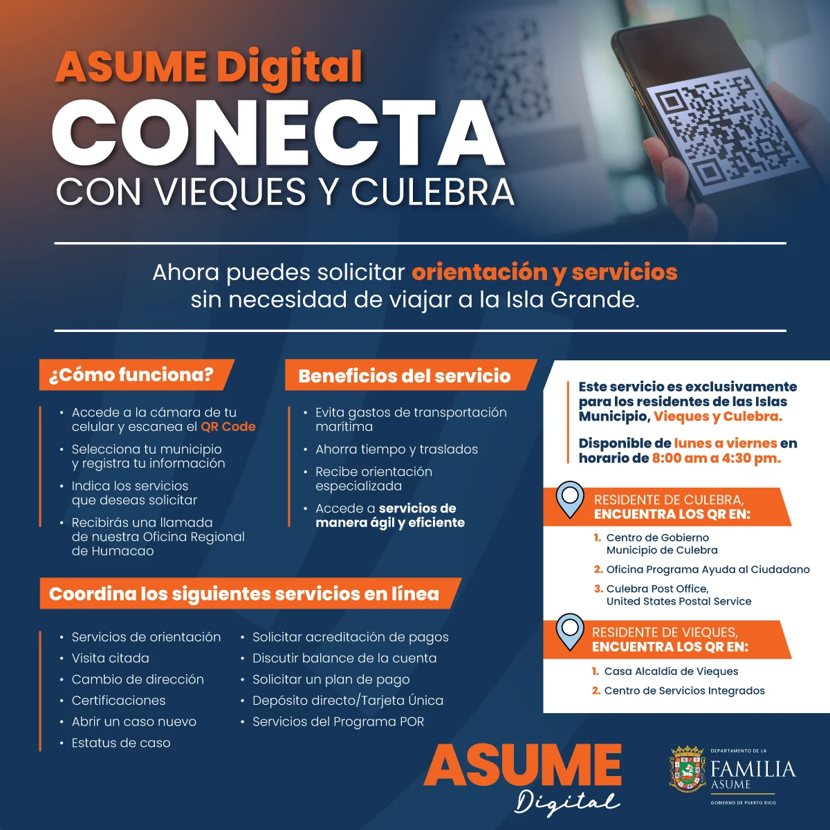 De igual forma, y en atención a la realidad geográfica de Vieques y Culebra, la agencia también implementó esta semana un sistema de códigos QR para facilitar el acceso a servicios sin que los ciudadanos tengan que trasladarse a Humacao. El código, único para la Oficina Regional de Humacao, está disponible en las oficinas del Centro de Servicios Integrados y en las alcaldías de ambos municipios. En el caso del Municipio de Culebra también se encuentra disponible en la Oficina Programa Ayuda al Ciudadano y en la Oficina de Correos del Servicio Postal de los Estados Unidos. Al escanearlo, el participante selecciona Vieques o Culebra y accede a una fila expreso; el personal técnico de Humacao recibe el registro y se comunica telefónicamente para brindar orientación y coordinar los trámites necesarios de forma remota.