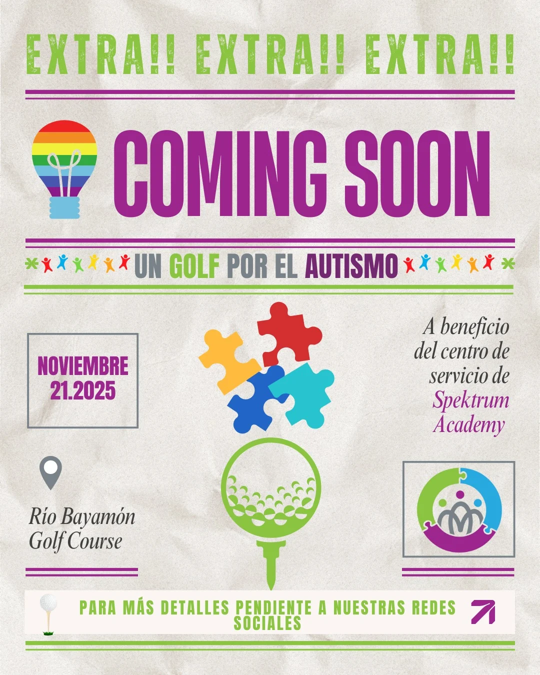 La organización Social Spektrum, dedicada al apoyo, educación y desarrollo de personas dentro del espectro del autismo, celebrará su Cuarto Torneo Benéfico “Un Golf por el Autismo” el viernes, 21 de noviembre de 2025, en el Río Bayamón Golf Course, en Bayamón, Puerto Rico. La jornada deportiva dará inicio con el shotgun a las 8:30 de la mañana y culminará con una subasta de clausura al finalizar la competencia.