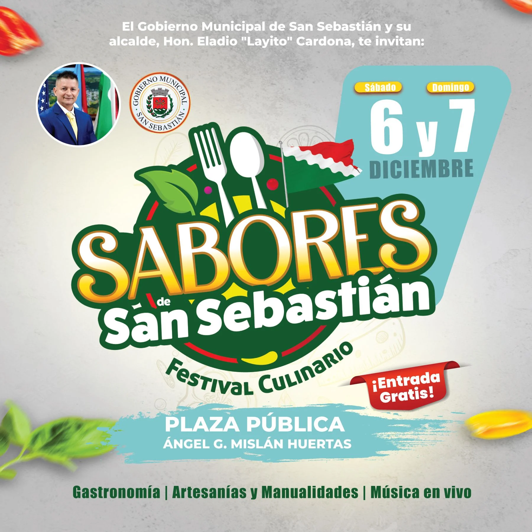Bajo el liderato del alcalde, Eladio «Layito» Cardona Quiles, el gobierno municipal de San Sebastián reafirma su compromiso con el impulso del desarrollo económico, cultural y turístico al anunciar la primera edición del Festival Culinario: Sabores de San Sebastián. La plaza pública Ángel G. Mislán Huertas será la sede de esta actividad familiar que se llevará a cabo el sábado 6 y el domingo 7 de diciembre, a partir de las 12:00 del mediodía.