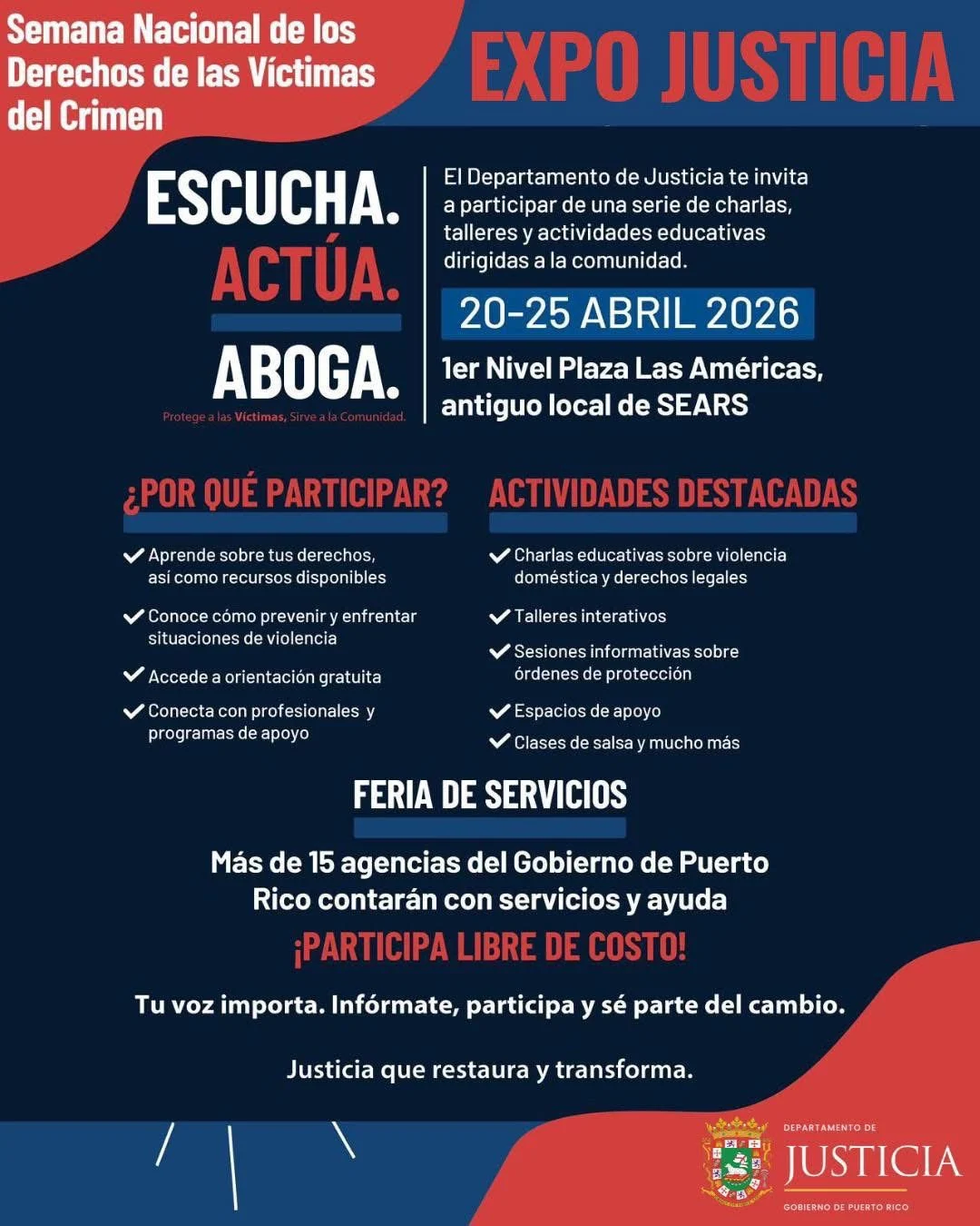 El Departamento de Justicia celebrará Expo Justicia, una iniciativa que reunirá esfuerzos educativos, comunitarios y de servicio directo a la ciudadanía del 20 al 25 de abril de 2026 en el primer nivel de Plaza Las Américas (antiguo local de Sears), en el marco de la Semana Nacional de los Derechos de las Víctimas del Crimen.