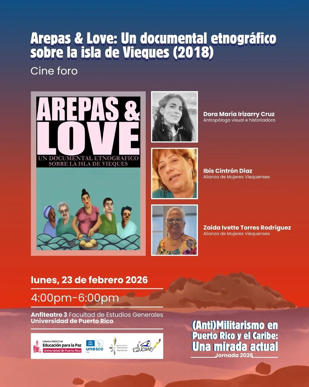 La Jornada (Anti)Militarismo en Puerto Rico y el Caribe: Una mirada Actual se celebrará en el Recinto de Río Piedras de la Universidad de Puerto Rico del 23 al 26 de febrero de 2026. Ante la creciente militarización de Puerto Rico y la región del Caribe, la jornada persigue conocer sobre las amenazas a la paz que representa el militarismo en la región, con énfasis en su impacto en Puerto Rico y la isla de Vieques. Se presentará el Foro Militarización del Caribe: Historia, Lecciones y Amenazas a la Paz, con la participación de Carlos Severino, Che Paralitici, Judith Conde y Gabriel Aguirre. Se proyectarán tres documentales sobre la lucha en contra del militarismo y la construcción de paz en la isla de Vieques, seguidos de un conversatorio con sus autores: Arepas & Love de Dora Irizarry Cruz, Vieques: Una batalla inconclusa de Juan Carlos Dávila y Vieques: archivo vivo de Juan Carlos Rodríguez. Todas las actividades se llevarán a cabo en el Anfiteatro #3 de la Facultad de Estudios Generales, de 4:00-6:00pm. Como parte de la jornada, se presentará en el vestíbulo del Centro Universitario la exposición Memorias del bombardeo de la niñez viequense (1999-2003).