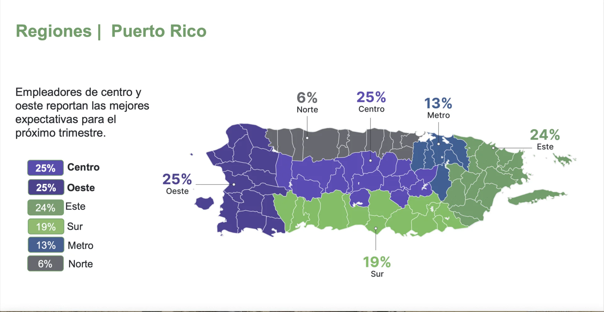 Melissa Rivera Roena, gerente general de ManpowerGroup Puerto Rico, indicó que el 27% de los patronos contestó que planifica contratar nuevos empleados, el 61% no pretende hacer cambios, 11% espera reducir la plantilla y 1% no sabe qué acciones concretas tomará.