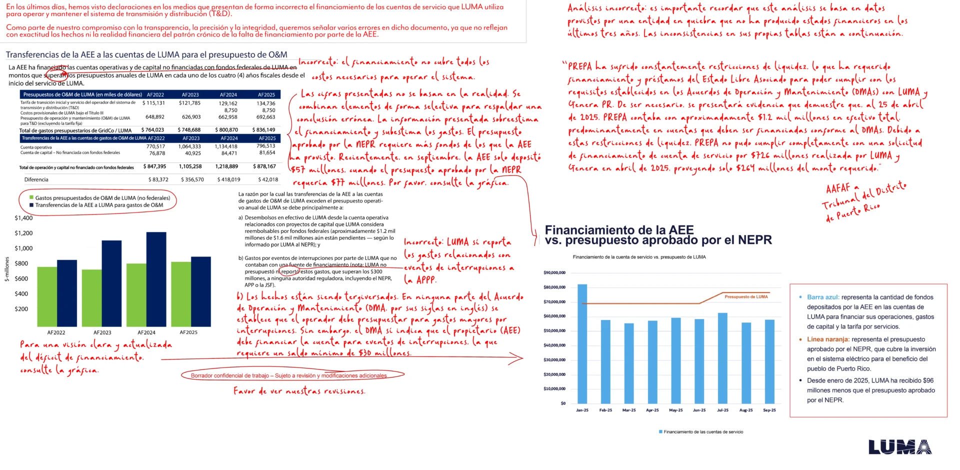 LUMA da la bienvenida y recibe con apertura cualquier proceso que busque atender con transparencia todos los asuntos que han provocado los ajustes presupuestarios que afectan el servicio eléctrico a nuestros clientes 1.5 millones de clientes.