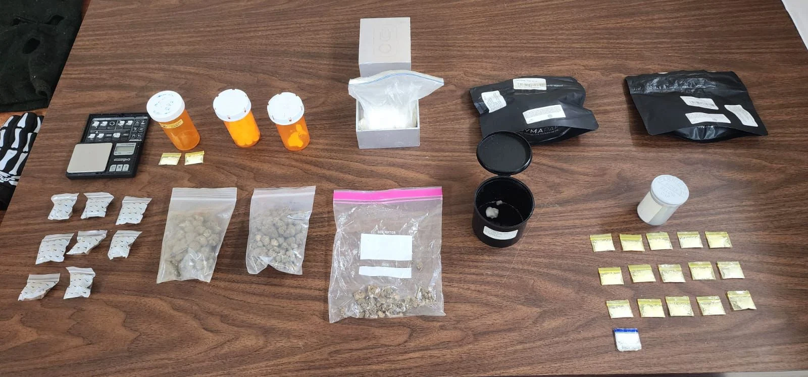 · Frasco plástico con piedra compacta de cocaína, una caja gris con una bolsa plástica con cocaína, 70 pastillas, bolsa plástica con picadura de marihuana