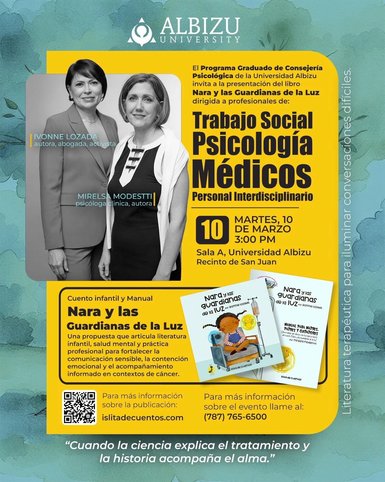 Islita de Cuentos, sello infantil de DVotoEditorial, anuncia la primera presentación oficial del libro ilustrado Nara y las Guardianas de la Luz, el próximo martes, 10 de marzo, a las 3:00 de la tarde, en la Universidad Albizu, Recinto de San Juan. El evento es convocado por el Programa Graduado de Consejería Psicológica de la institución y estará dirigido a profesionales del trabajo social, psicología, medicina, consejería y personal multidisciplinario interesados en herramientas terapéuticas y educativas para acompañar a menores diagnosticados con cáncer y a sus familias.