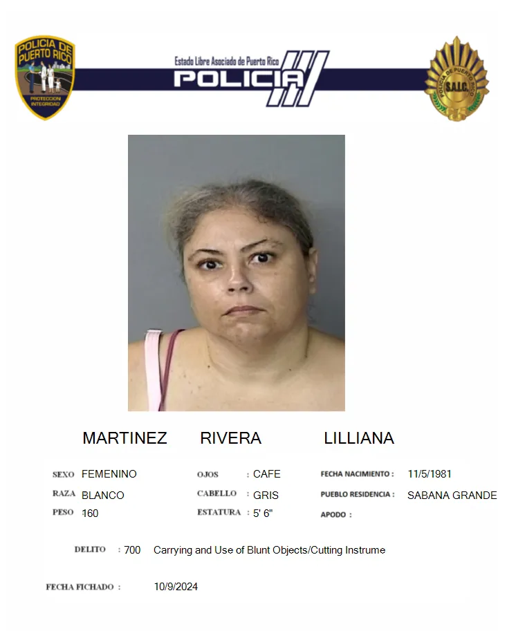 En horas de la mañana del 9 de octubre de 2024 y en el Tribunal de Mayagüez el sargento Luis Enrique Rodríguez supervisor del Distrito de Sabana Grande, adscrito al Negociado de la Policía de Puerto Rico, consultó un caso con la fiscal Yanitza Negrón, que culminó con la radicaron de cargos criminales por los delitos de amenaza, alteración a la paz y ley de armas contra la señora Lilliana Martínez Rivera de 42 años residente en Sabana Grande. La imputada llegó frente a la residencia de la querellante y perjudicada en el barrio Las Guaras en Sabana Grande y portando un cuchillo de cocina le invitó a salir de su casa, amenazándola que la iba a matar y le profirió palabras soeces. El caso fue llevado ante la presencia de la juez María Del Pilar Vázquez Muñiz, quien luego de examinar la prueba encontró causa en regla 6, imponiéndole una fianza global de $75 mil dólares y emitiendo de inmediato una orden de arresto, esta fue ingresada en la cárcel de Mujeres de Bayamón al no prestar la misma. La Vista Preliminar fue pautada para el 10 de octubre de 2024.