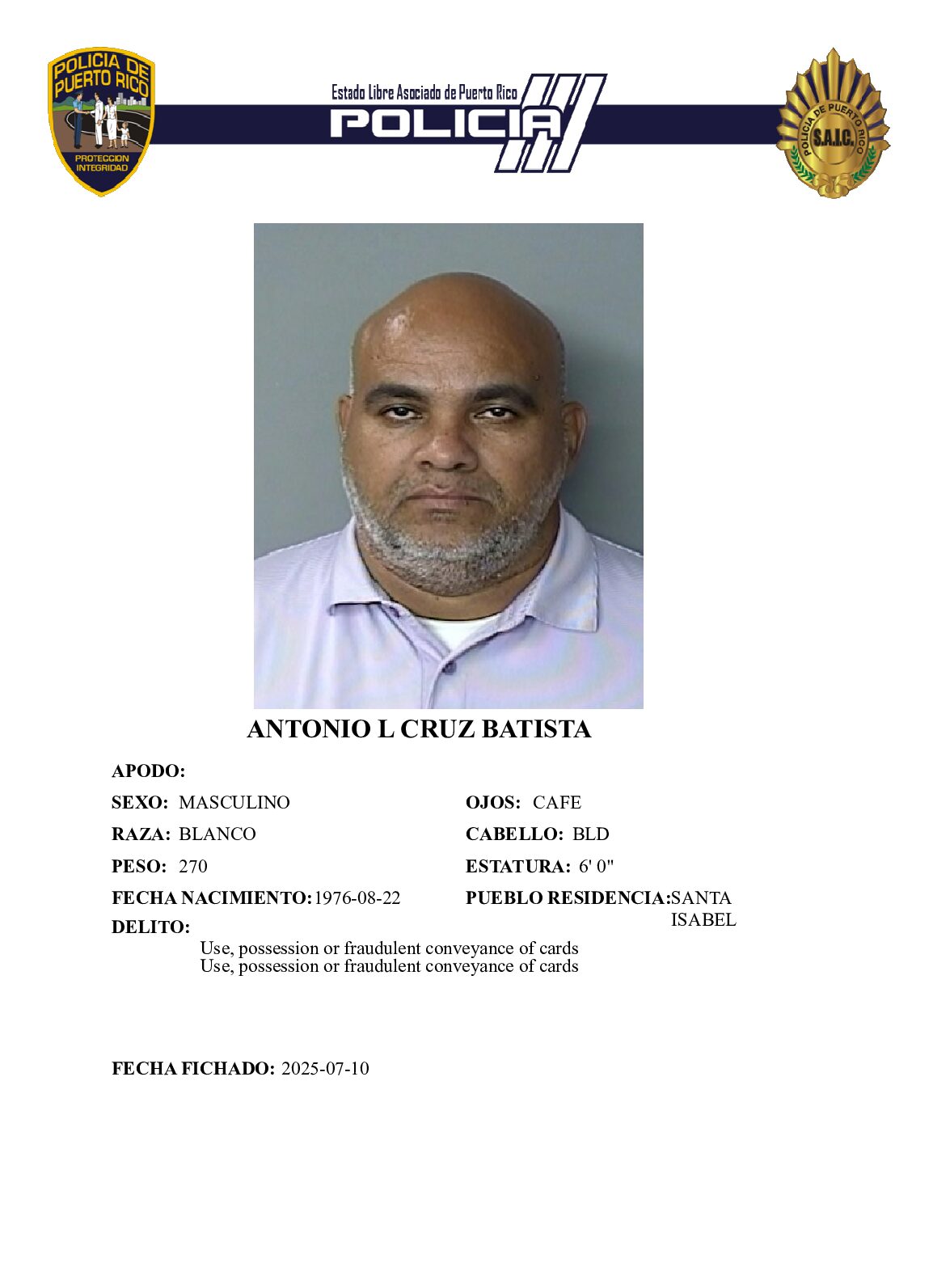 En horas de la tarde del 10 de julio de 2025 y en el Tribunal de Mayagüez, el agente Wilfredo Torres Ramos en unión al teniente Henry Cruz Casanova del Distrito de Cabo Rojo, adscritos al Negociado de la Policía de Puerto Rico, consultaron un caso con el fiscal José Arrocho Soto de la Fiscalía de Mayagüez, que culminó con la radicaron de cargos criminales por el delito de Fraude en Ejecución de Obras, “2 cargos” contra Antonio L. Cruz Batista residente en Santa Isabel.