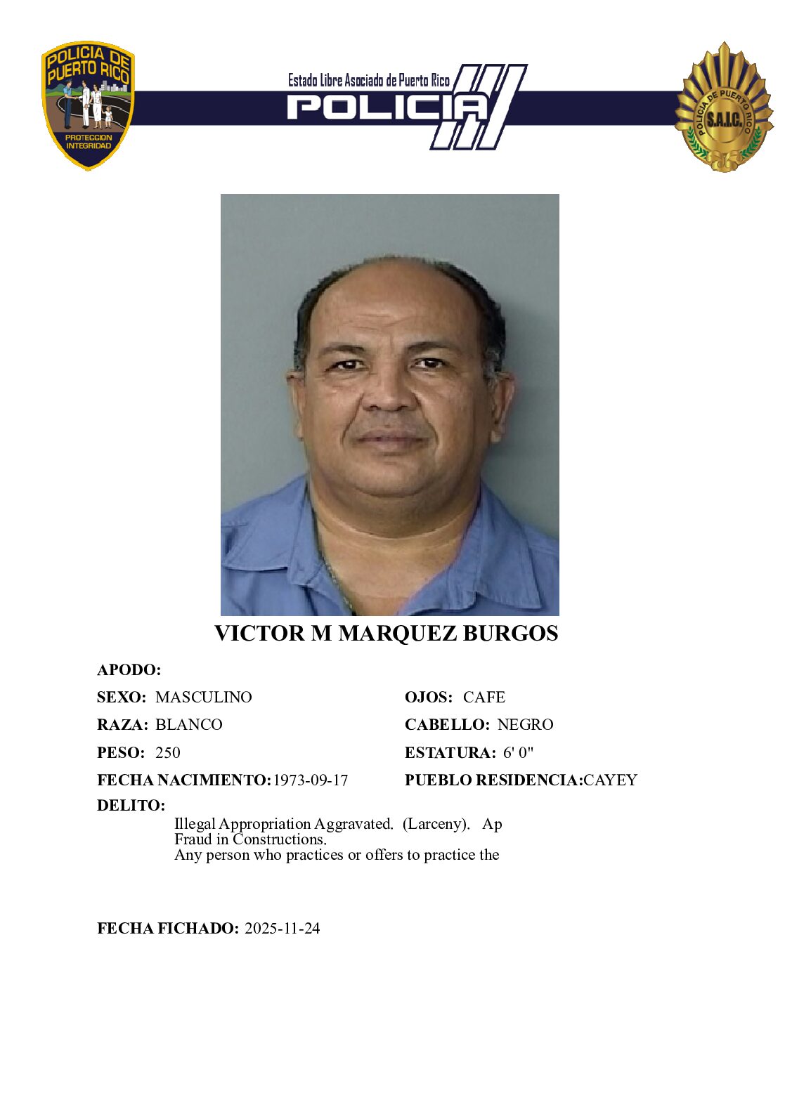 Para la fecha del 24 de noviembre, en el Tribunal de Mayagüez le fueron radicados cargos criminales a Víctor M. Márquez Burgos, 52 años residente de Cayey, por el Artículo 182 (apropiación ilegal), Artículo 204 (fraude)y el Artículo 35 de la Ley 173.