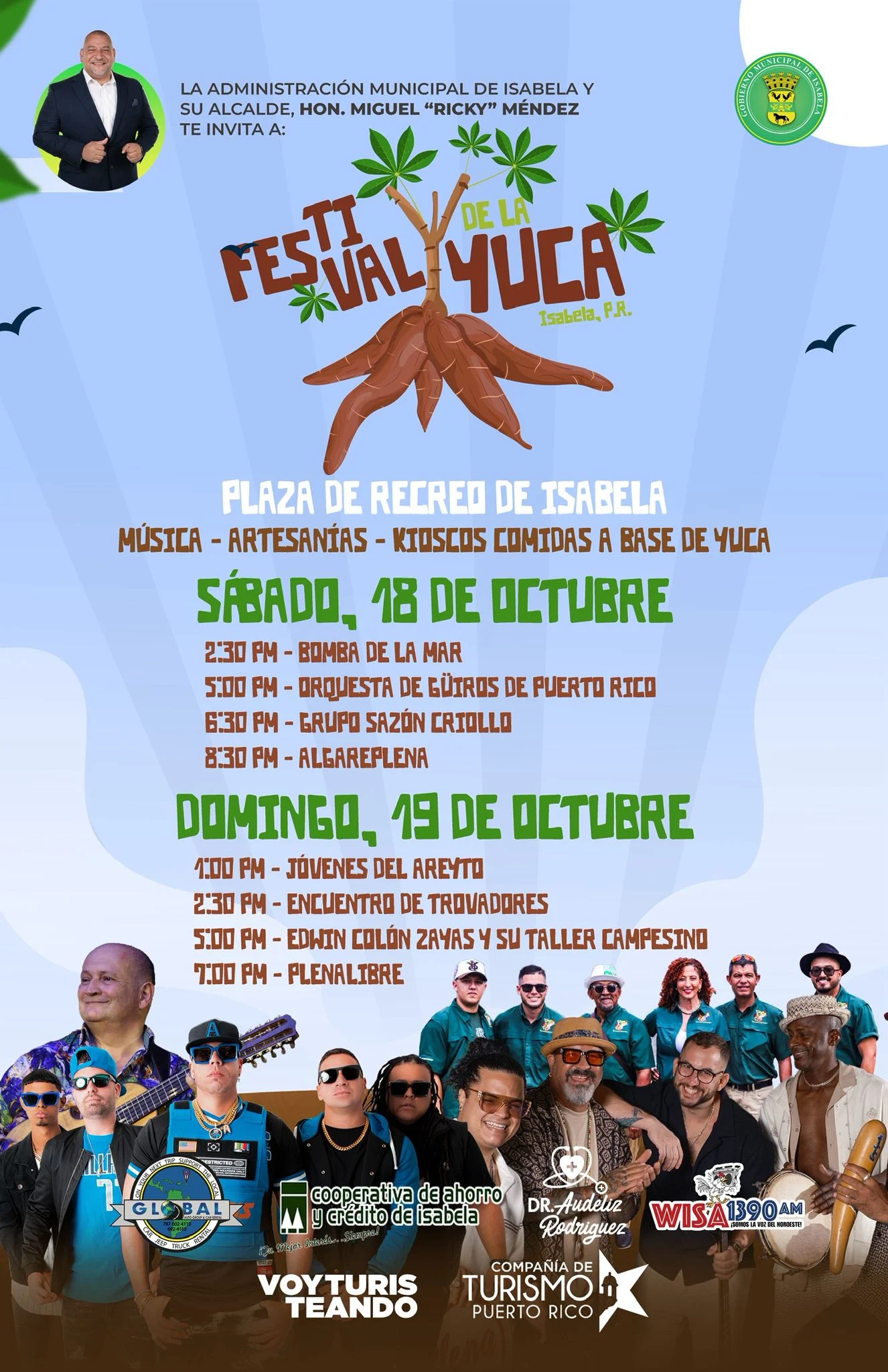 El alcalde de Isabela, Ing. Miguel ‘Ricky’ Méndez Pérez, informó que el sábado 18 y domingo 19 de octubre, la Plaza de Recreo Manuel Corchado y Juarbe se llena de música, artesanías, kioscos y las mejores delicias confeccionadas a base de yuca. “Vuelve el Festival de la Yuca en Isabela, un evento que celebra nuestras raíces, tradiciones y el sabor isabelino que nos distingue. Ya se sabe que Isabela es de Puerto Rico la más bella”, señaló el alcalde.