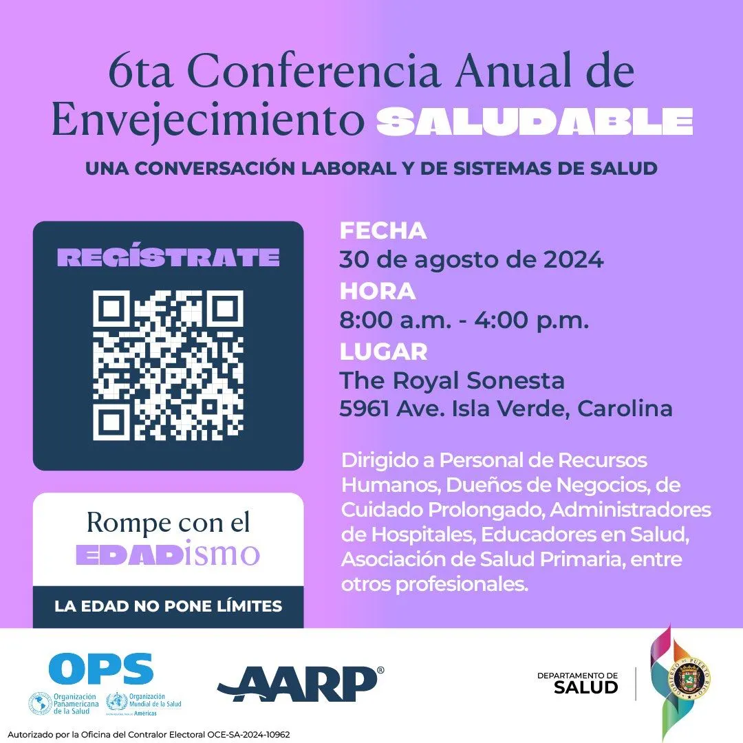 Con el objetivo de concienciar y capacitar a profesionales de todos los sectores sobre la importancia de las conversaciones necesarias para combatir el edadismo, el Departamento de Salud llevará a cabo la 6ta Conferencia Anual de Envejecimiento Saludable: Una conversación laboral y de sistema de salud el 30 de agosto de 2024 en el Hotel Sonesta, en San Juan.