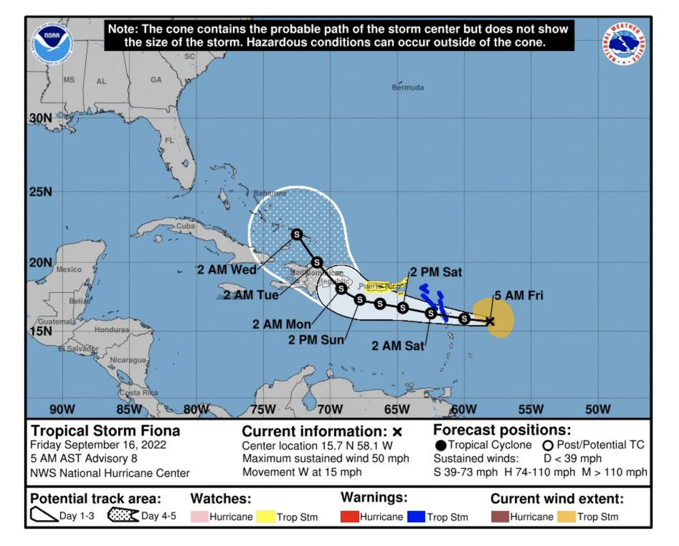 La tormenta tropical Fiona continúa moviéndose hacia el oeste y ahora se encuentra a unas 265 millas al este-sureste de las Islas de Sotavento.